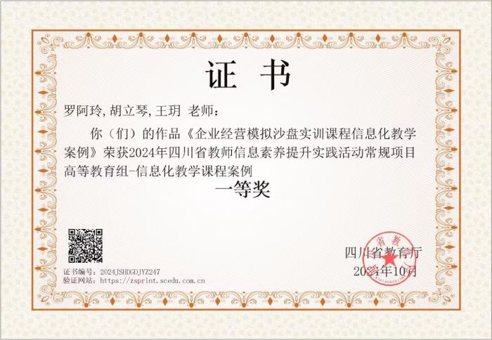 获得省级以上教学成果奖3项,省级以上专业荣誉4项,《企业经营模拟沙盘实训》、《网络营销》、《电商视觉设计》课程获取省级以上课程荣誉10余次。