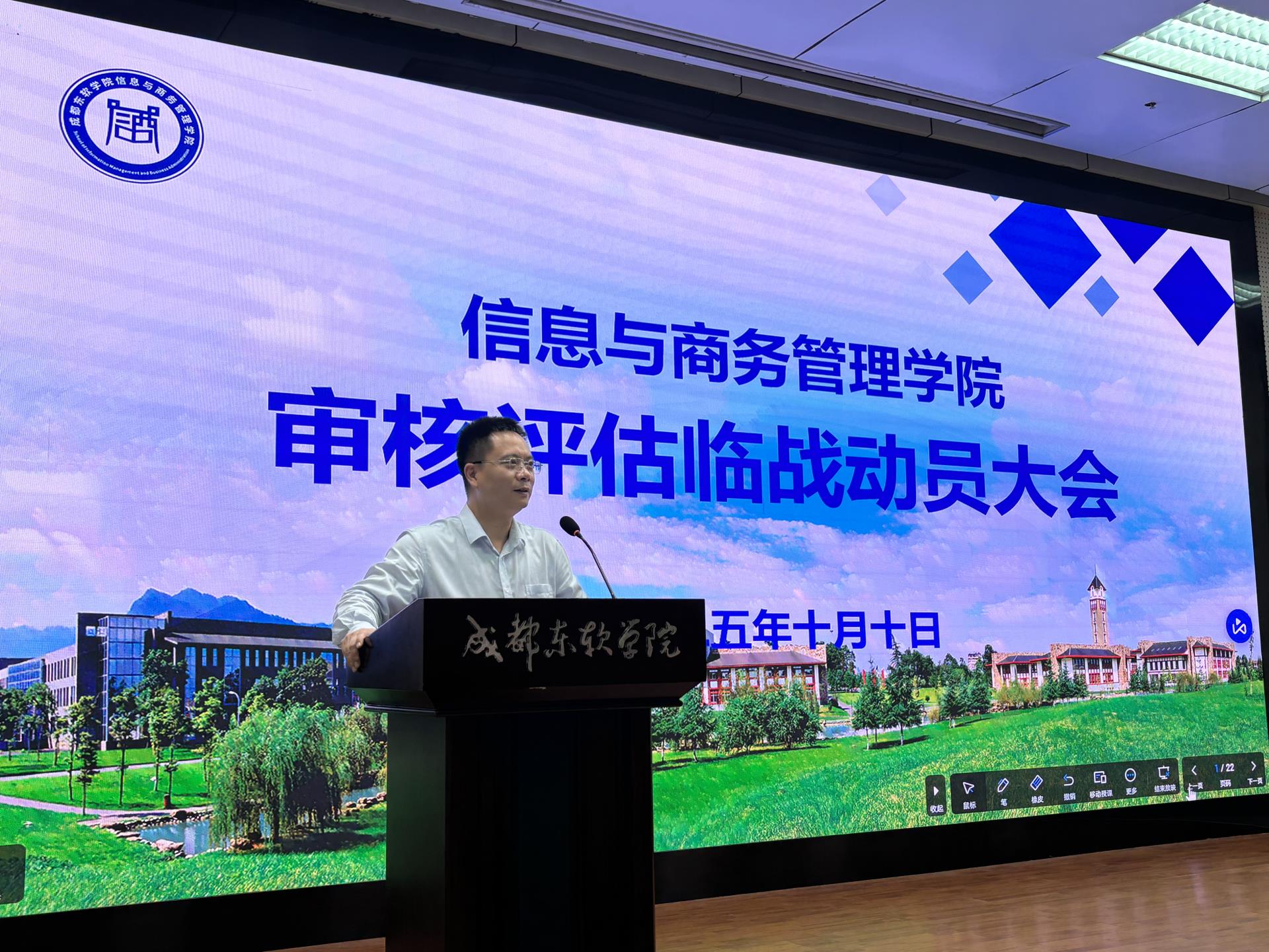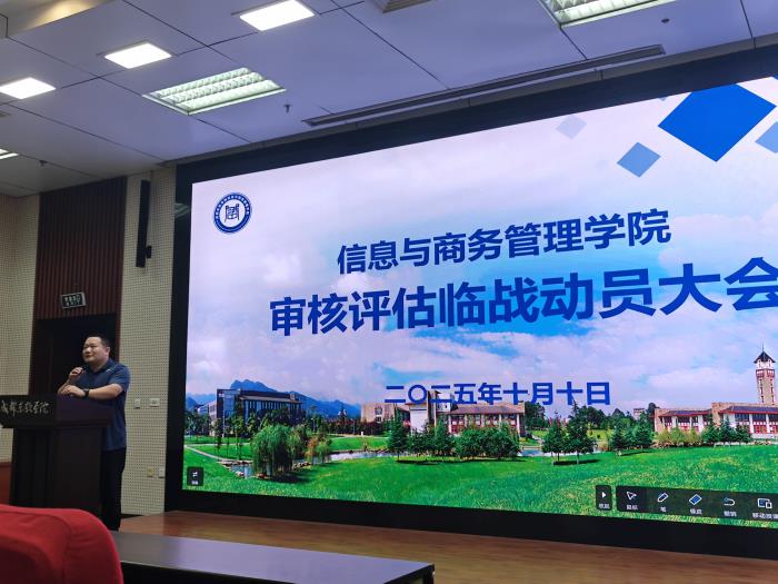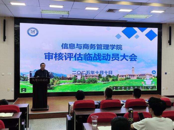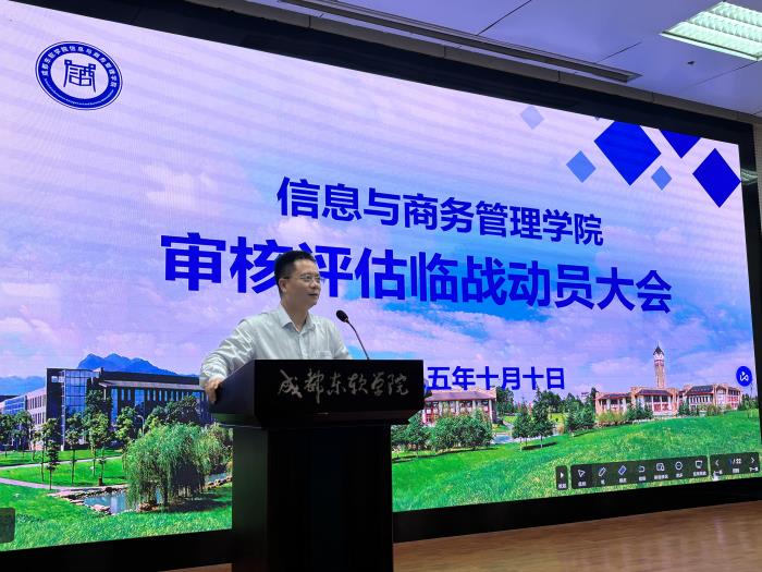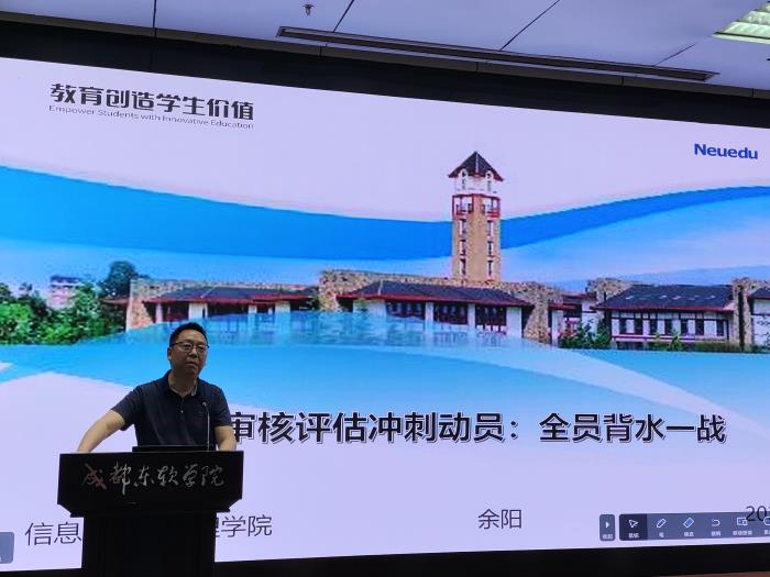 为全面推进本科教育教学审核评估迎评工作,全面提升人才培养质量,近日,成都东软学院信息与商务管理学院召开审核评估临战动员大会,学院全体教师到场参会。本次会议由学院党政办公室冯宇老师主持。