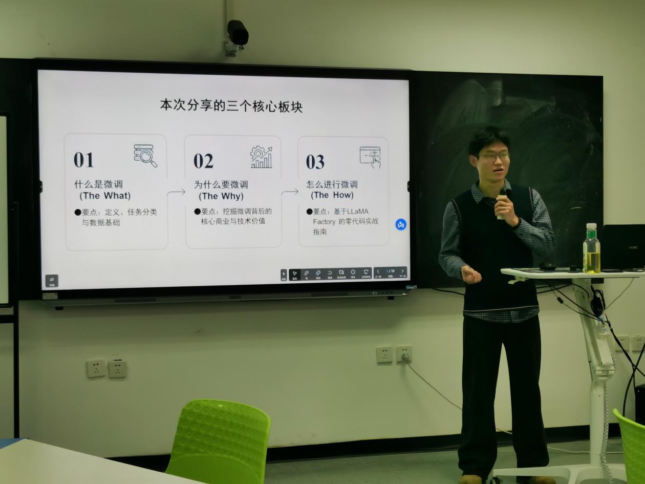 12月25日下午,成都东软学院大模型应用与研发中心科研沙龙暨中心第三十九场分享会顺利举行。本场沙龙由科研部刘轩老师主持,基础教学学院金树林老师担任主讲嘉宾,围绕“大模型蒸馏与微调实战”展开系统讲解。大模型应用与研发中心相关人员、各学院科研骨干教师共同参与了本次研讨。